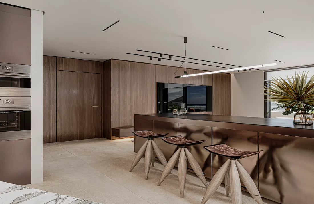 Crafted with top-quality materials and attention to detail, the designer kitchen comes fully equipped with high-end appliances, ready for living and entertaining. Comfort is ensured year-round with an aerothermal climate system combined with high-efficiency ducted air conditioning, and there’s also the option to add underfloor heating for enhanced thermal luxury.